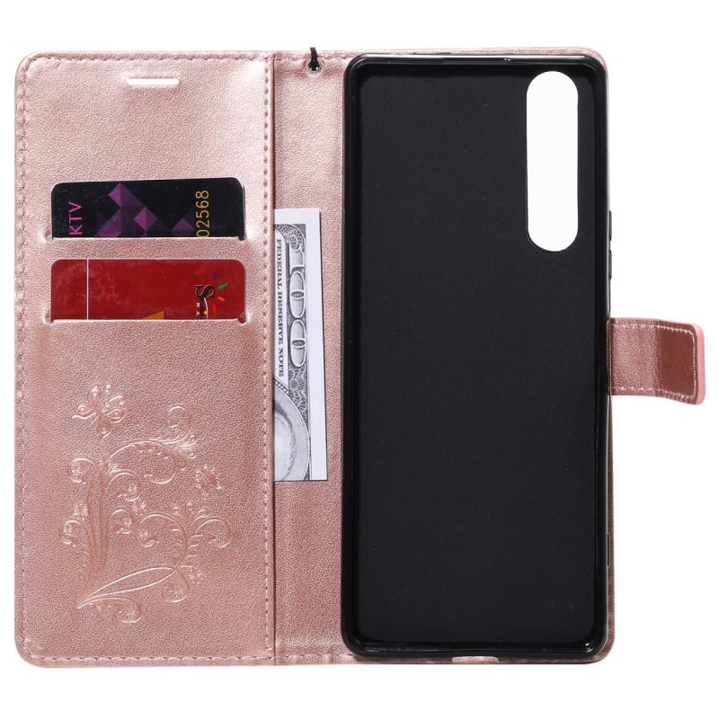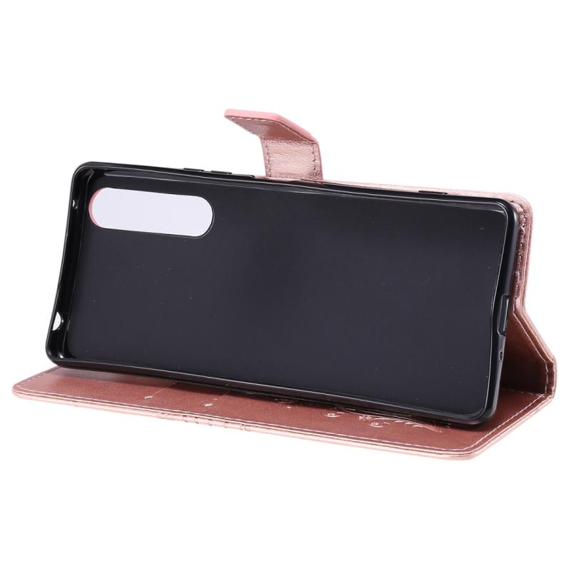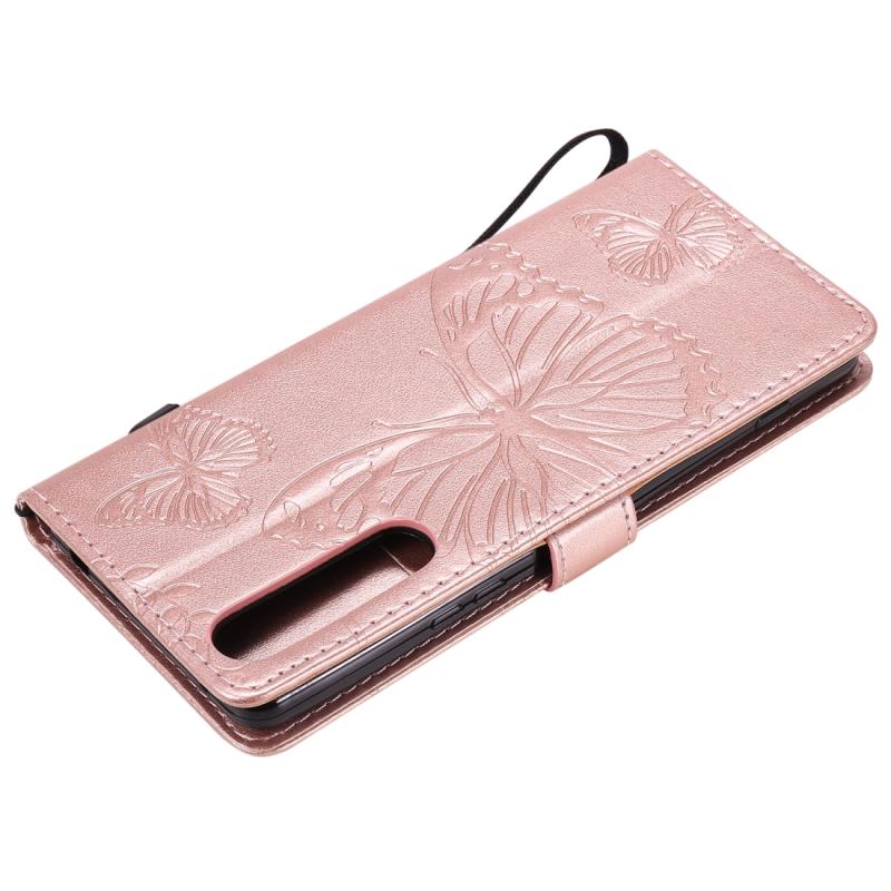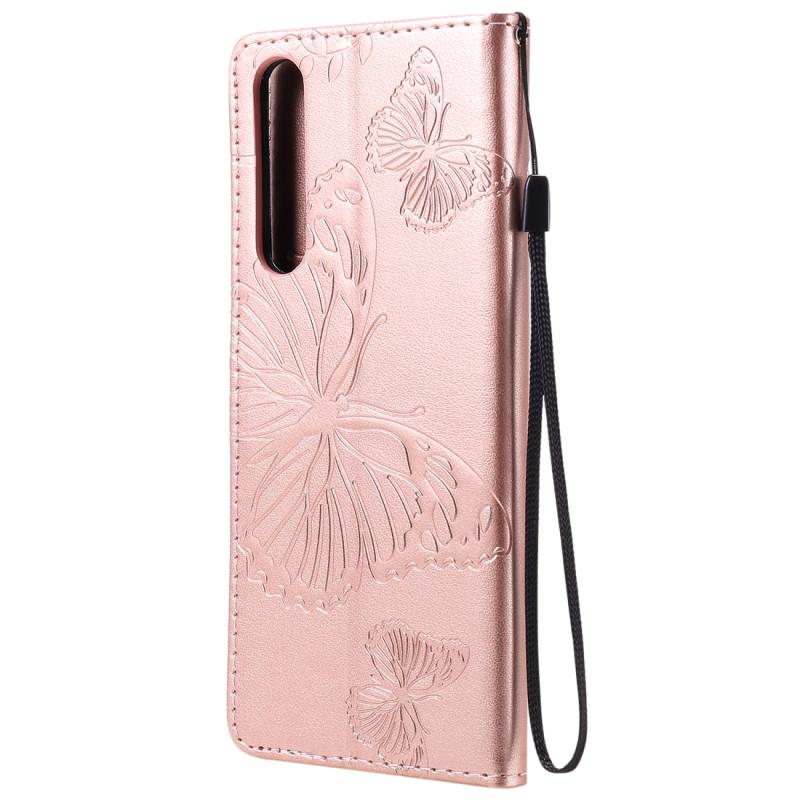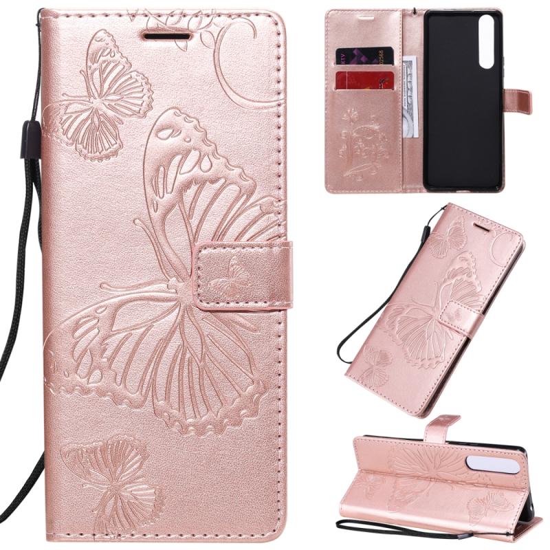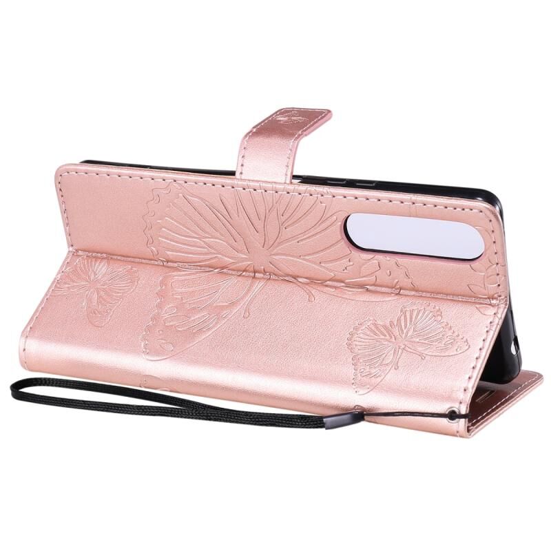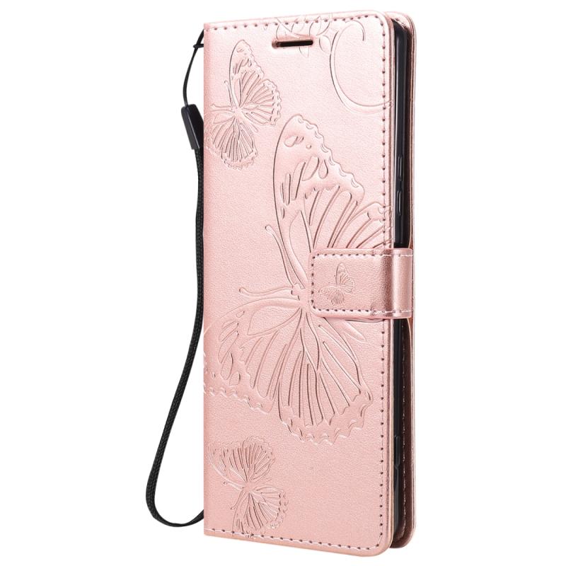 Θήκη δέρματος οριζόντιας αναδίπλωσης για Sony Xperia 1 II με ανάγλυφο σχέδιο 3D πεταλούδων, με βάση, θήκη καρτών, πορτοφόλι και λουρί (Χρυσό Ρόδινο).