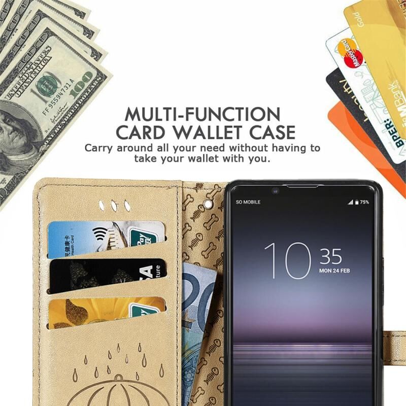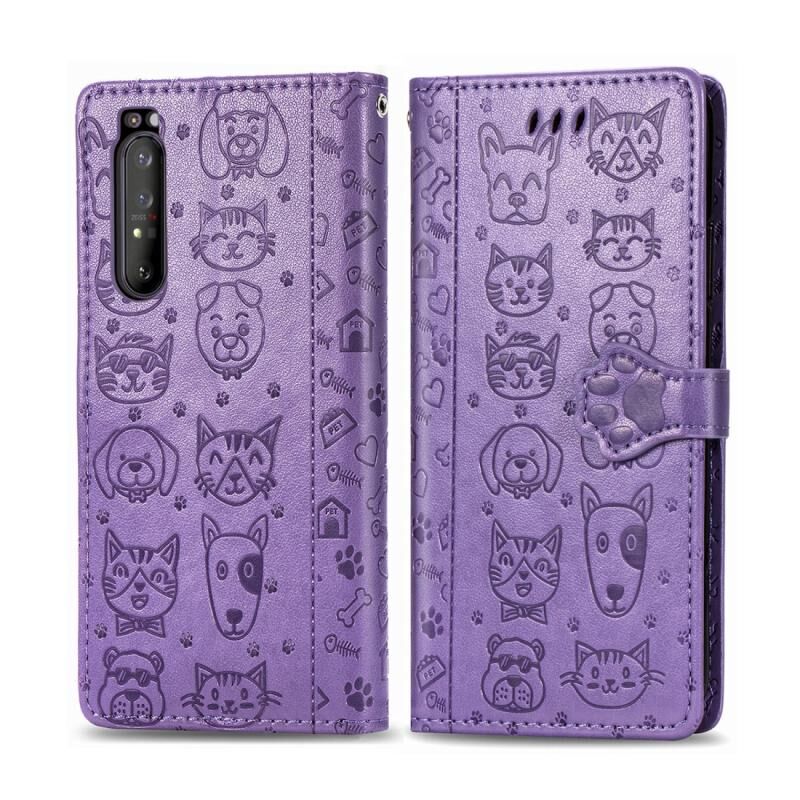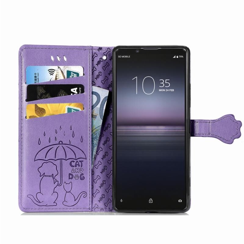Θήκη δέρματος οριζόντιας αναδίπλωσης με ανάγλυφα σχέδια χαριτωμένων γάτας και σκύλου για Sony Xperia 1 II, με βάση / υποδοχή κάρτας / πορτοφόλι / κορδόνι (Ροζ)