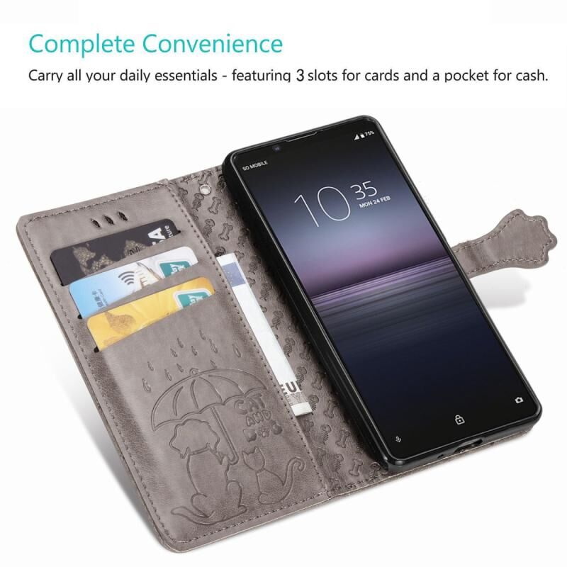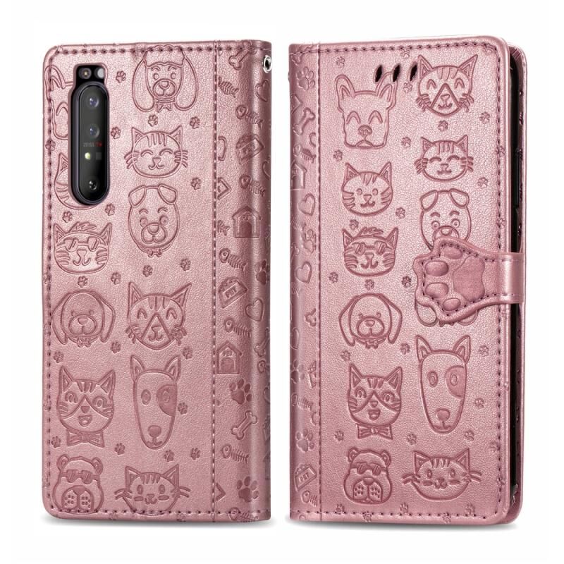 Θήκη δέρματος οριζόντιας αναδίπλωσης με ανάγλυφα σχέδια χαριτωμένων γάτας και σκύλου για Sony Xperia 1 II, με βάση / υποδοχή κάρτας / πορτοφόλι / κορδόνι (Ροζ)