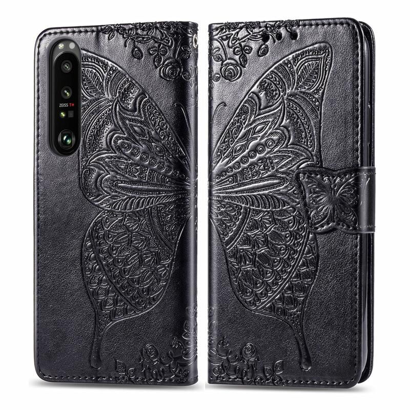 Για Sony Xperia 1 III Πεταλούδα αγάπη λουλούδι ανάγλυφο οριζόντια Flip δερμάτινη θήκη με στήριγμα / υποδοχή για κάρτες / πορτοφόλι / κορδόνι (μαύρο)