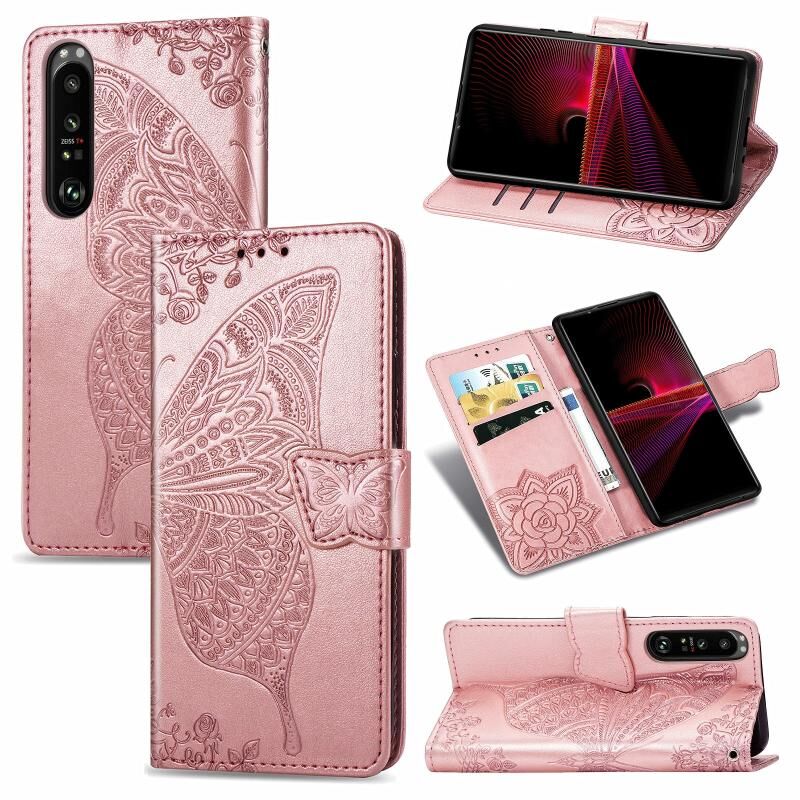 Για Sony Xperia 1 III Πεταλούδα αγάπη λουλούδι ανάγλυφο οριζόντια Flip δερμάτινη θήκη με στήριγμα / υποδοχή για κάρτες / πορτοφόλι / κορδόνι (ροζ χρυσό)