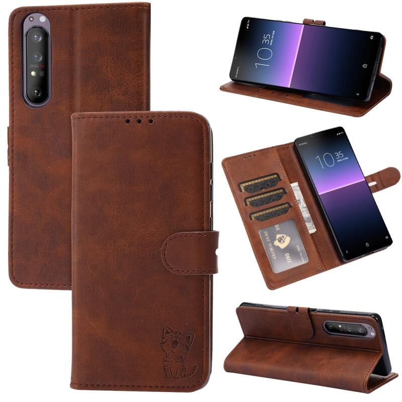 Για Sony Xperia 1 III Ανάγλυφο Happy Cat Pattern Οριζόντια Flip δερμάτινη θήκη με θήκη & υποδοχές για κάρτες & πορτοφόλι (καφέ)