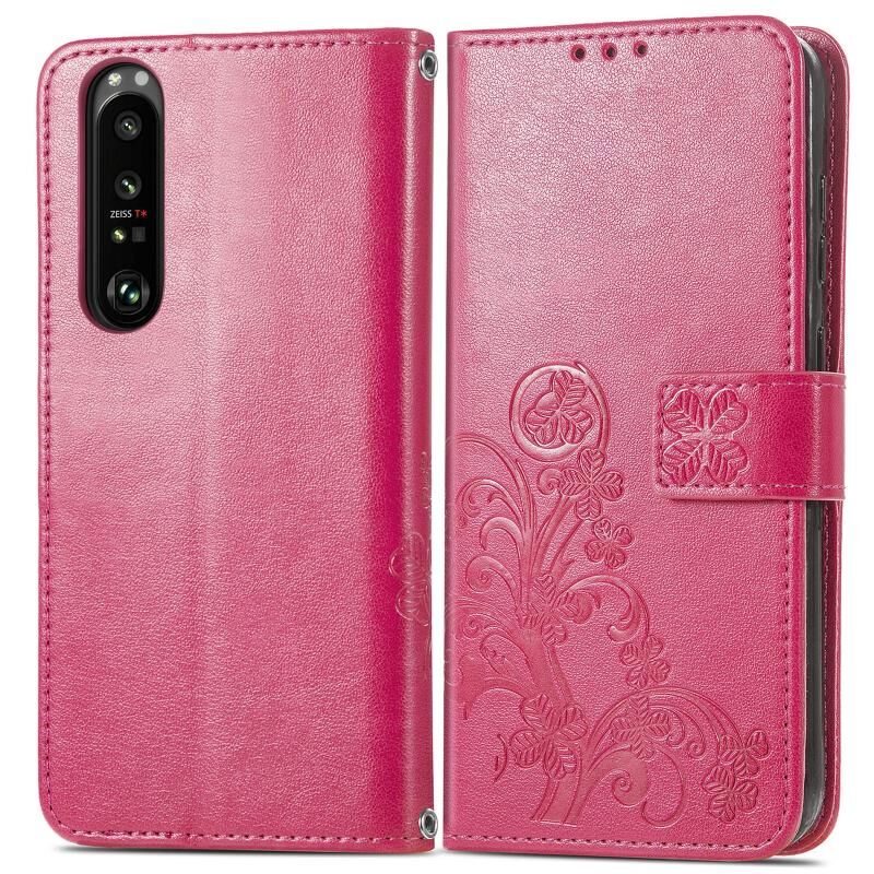 Για το Sony Xperia 1 III Four-leaf Clasp ανάγλυφη αγκράφα Κινητό τηλέφωνο προστασία δερμάτινη θήκη με κορδόνι & υποδοχή για κάρτες & πορτοφόλι & λειτουργία βραχίονα (Magenta)