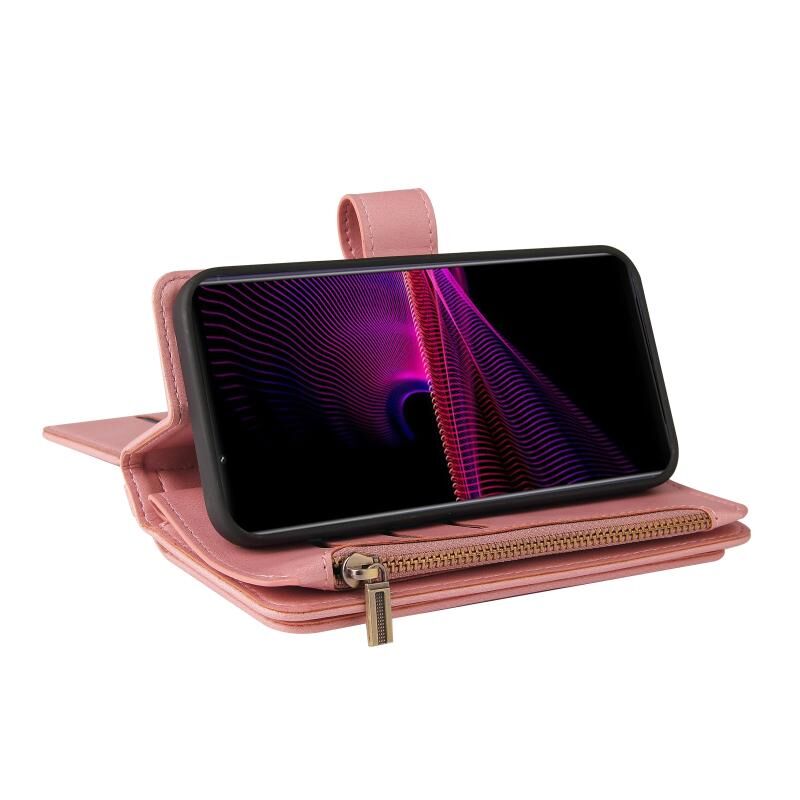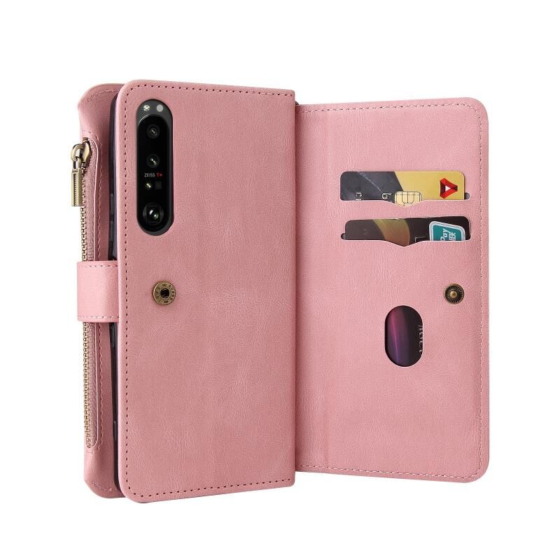 Για Sony Xperia 1 III Skin Feel PU + TPU Οριζόντια Flip δερμάτινη θήκη με θήκη & 15 κάρτες Slot & πορτοφόλι & φερμουάρ τσέπη & κορδόνι (ροζ)