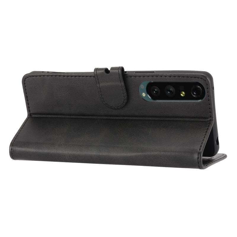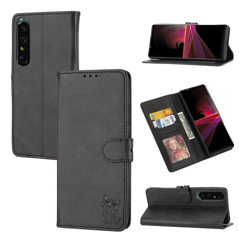 Θήκη τηλεφώνου δερμάτινη με ανάγλυφο σχέδιο χαρούμενης γάτας για Sony Xperia 1 IV (Γκρι)