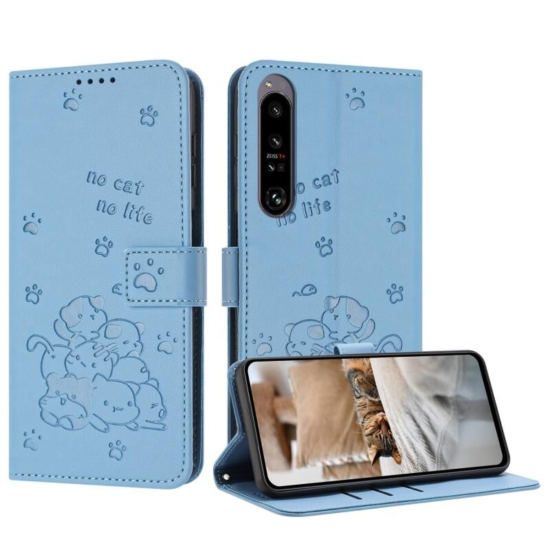 Θήκη δερμάτινη για Sony Xperia 1 IV με ανάγλυφο γατάκι και λουρί (Μωβ)