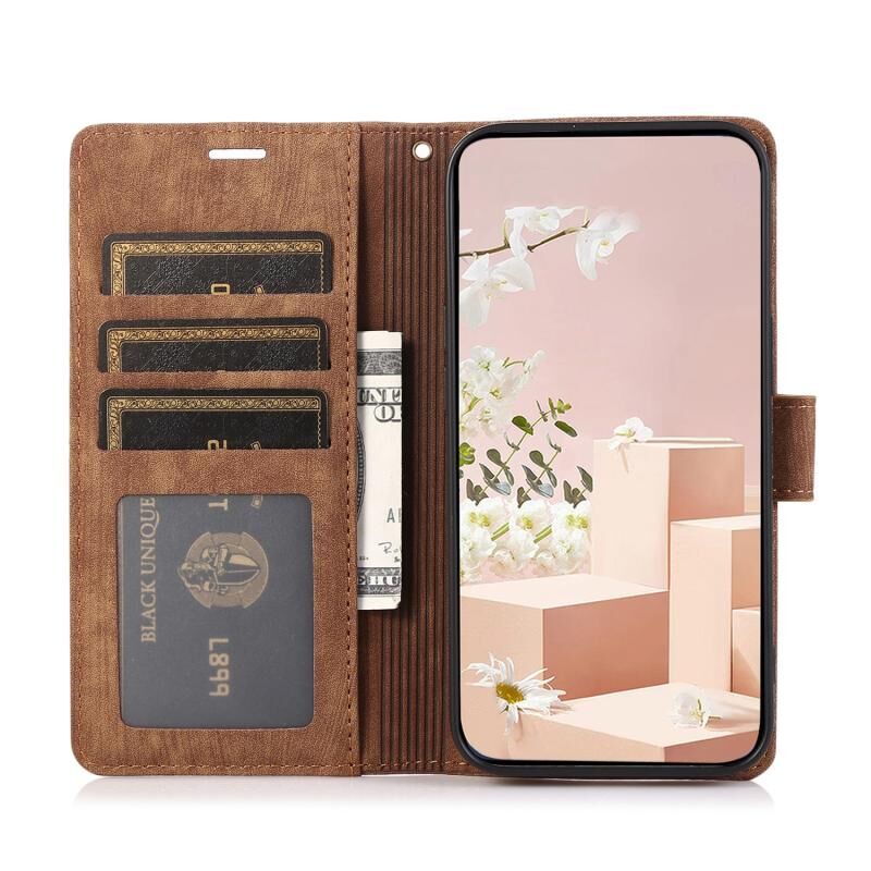 3. Θήκη πορτοφολιού με κάρτες: Συνδυασμός πορτοφολιού και θήκης κινητού τηλεφώνου, με υποδοχές για κάρτες ταυτότητας και πιστωτικές κάρτες, μπορεί να χρησιμοποιηθεί ως πορτοφόλι για να κρατάει πολλές πιστωτικές κάρτες, μετρητά, ταυτότητα και χρήματα.