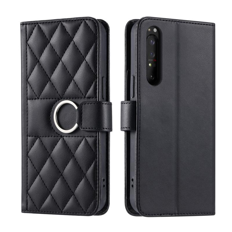 For Sony Xperia 1 IV Ring Buckle Rhombic Leather Phone Case(Black)