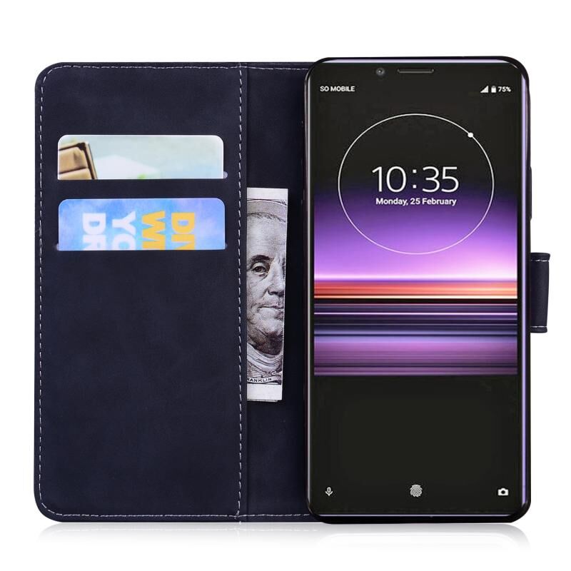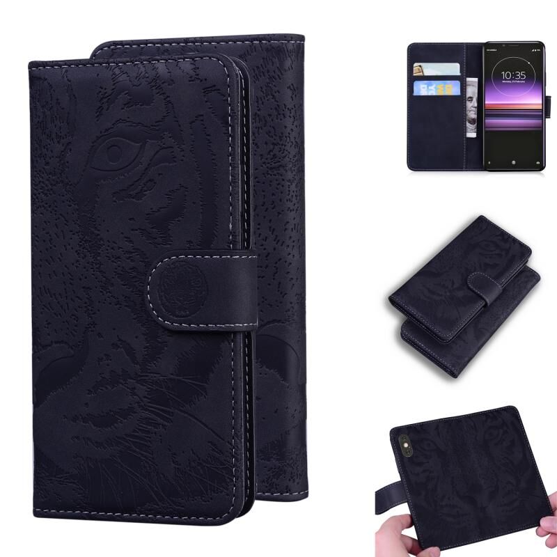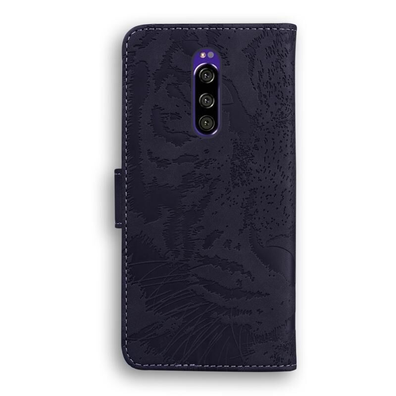 Θήκη δέρματος οριζόντιας αναδίπλωσης με ανάγλυφο μοτίβο τίγρης για Sony Xperia 1 με βάση & υποδοχές καρτών & πορτοφόλι (Μαύρο)