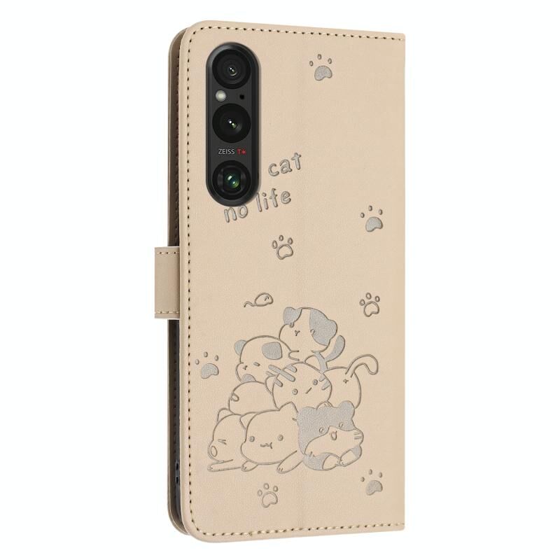 Θήκη δερμάτινη για Sony Xperia 1 V 2023 με ανάγλυφο σχέδιο γατάκι και κορδόνι (Μπεζ)