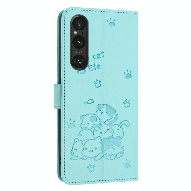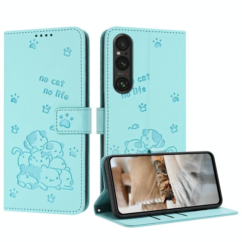 Θήκη δερμάτινη για Sony Xperia 1 V 2023 με ανάγλυφο σχέδιο γατάκι και κορδόνι (Μωβ)