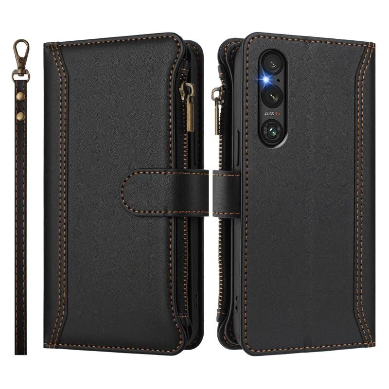 For Sony Xperia 1 V 2023 Magnetic Closure 9 Card Slots Zipper Leather Case with Hand Strap(Black)