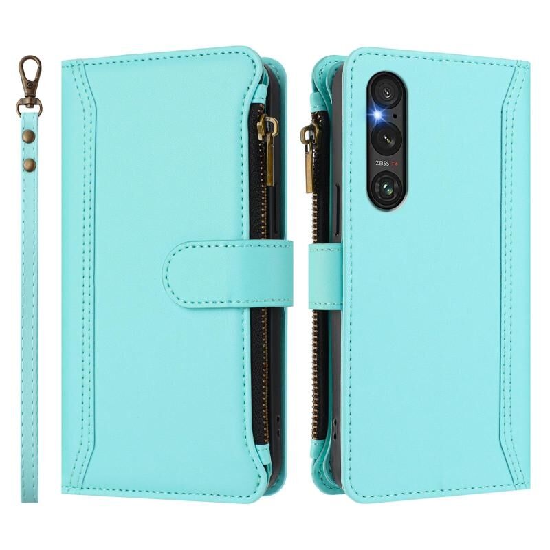 For Sony Xperia 1 V 2023 Magnetic Closure 9 Card Slots Zipper Leather Case with Hand Strap(Mint Green)