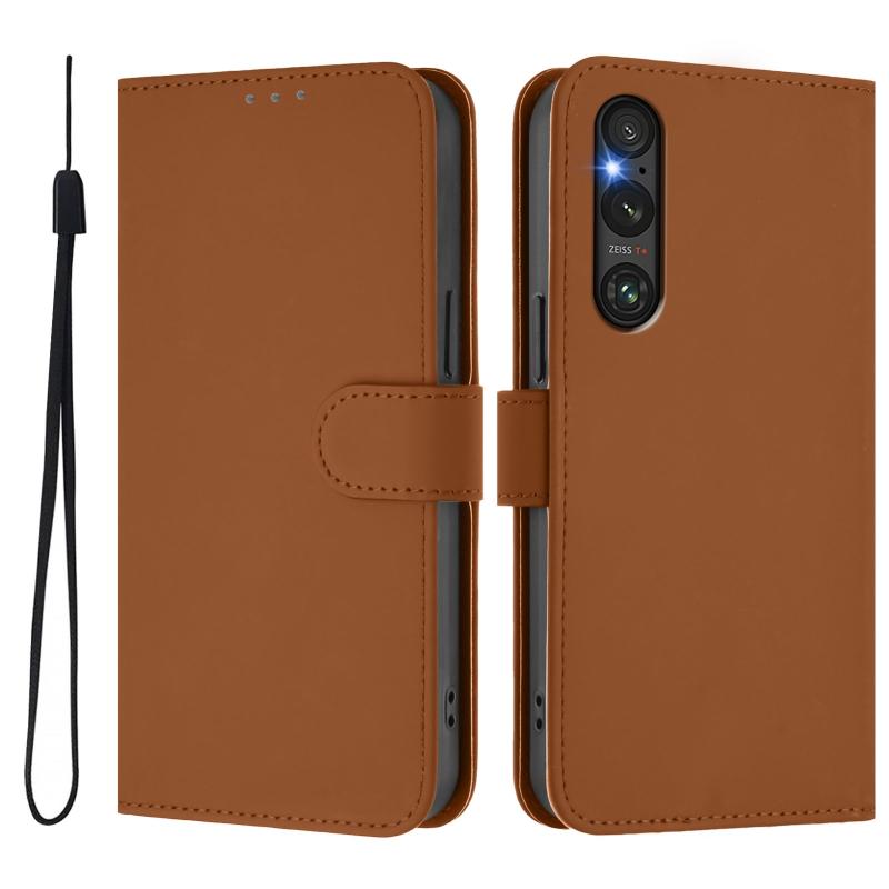 For Sony Xperia 1 V 2023 Skin Feel Solid Color Leather Phone Case with Lanyard(Brown)