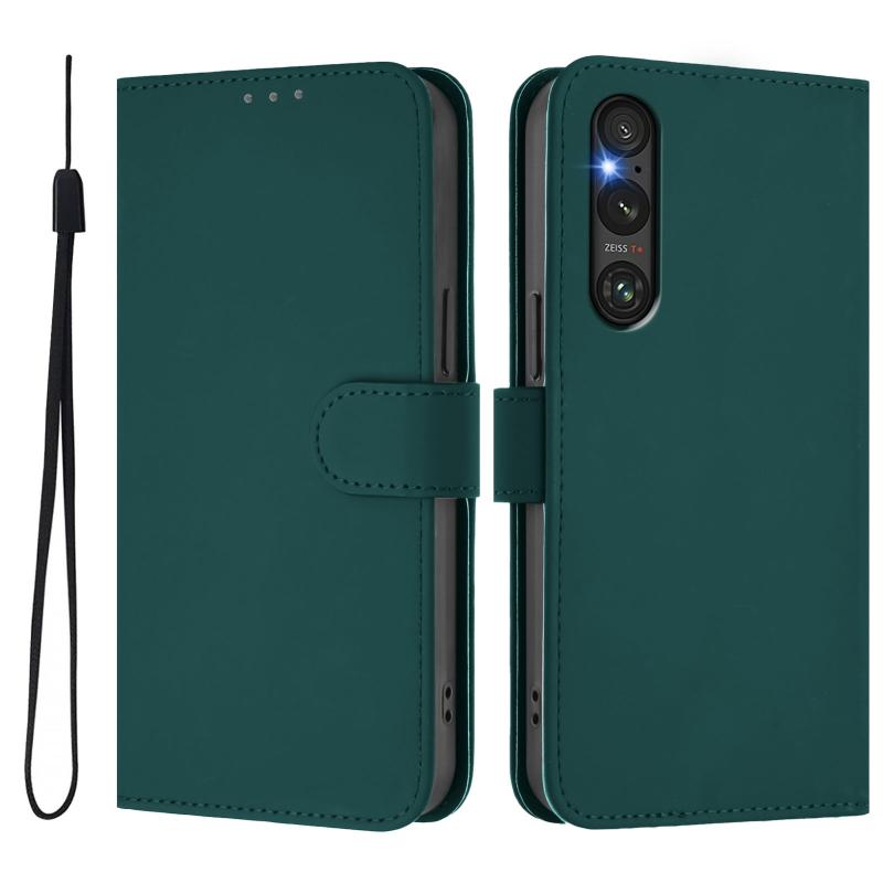 For Sony Xperia 1 V 2023 Skin Feel Solid Color Leather Phone Case with Lanyard(Dark Green)