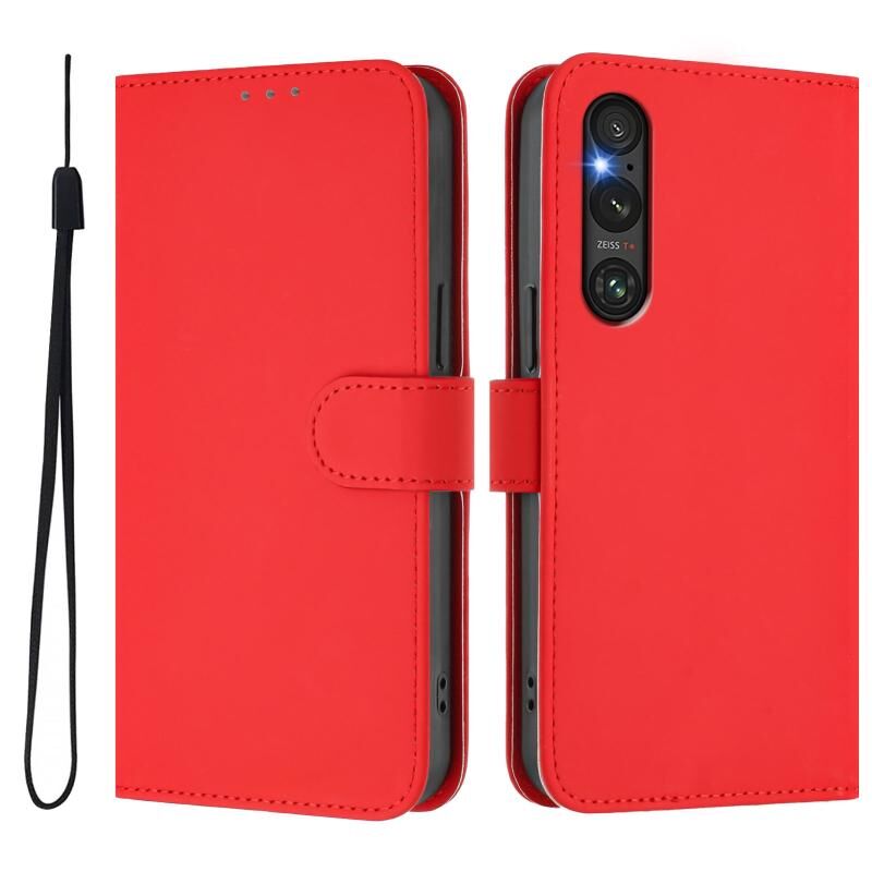 For Sony Xperia 1 V 2023 Skin Feel Solid Color Leather Phone Case with Lanyard(Red)