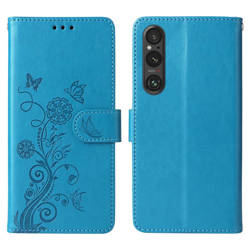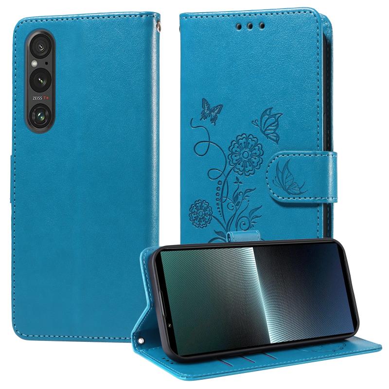 For Sony Xperia 1 V Embossed Butterfly Flowers Leather Phone Case(Blue)