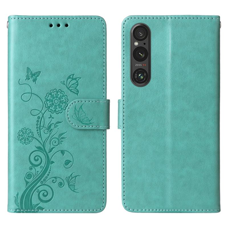 For Sony Xperia 1 V Embossed Butterfly Flowers Leather Phone Case(Green)