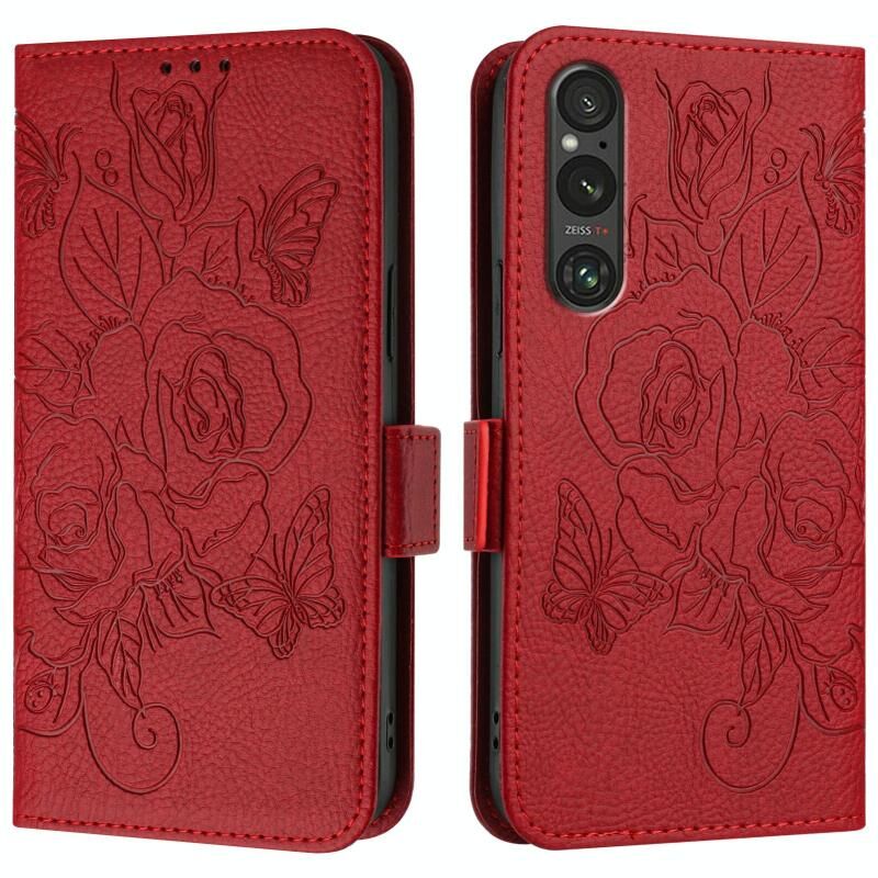 Για Sony Xperia 1 V ανάγλυφο Rose RFID Anti-theft δερμάτινη θήκη τηλεφώνου (κόκκινο)