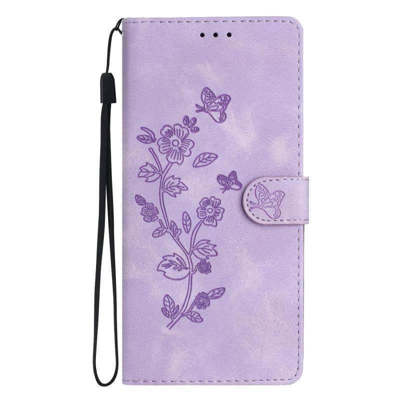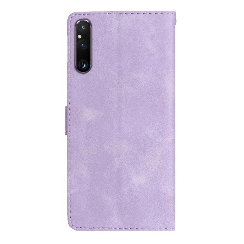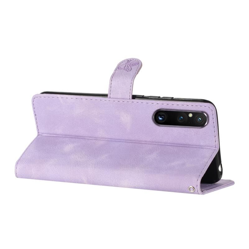 Θήκη τηλεφώνου δερμάτινη με ανάγλυφο σχέδιο λουλουδιών πεταλούδας για Sony Xperia 1 V (Μωβ)