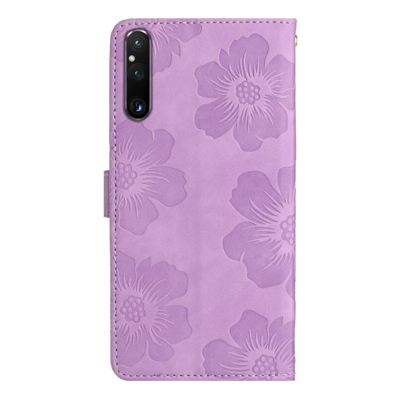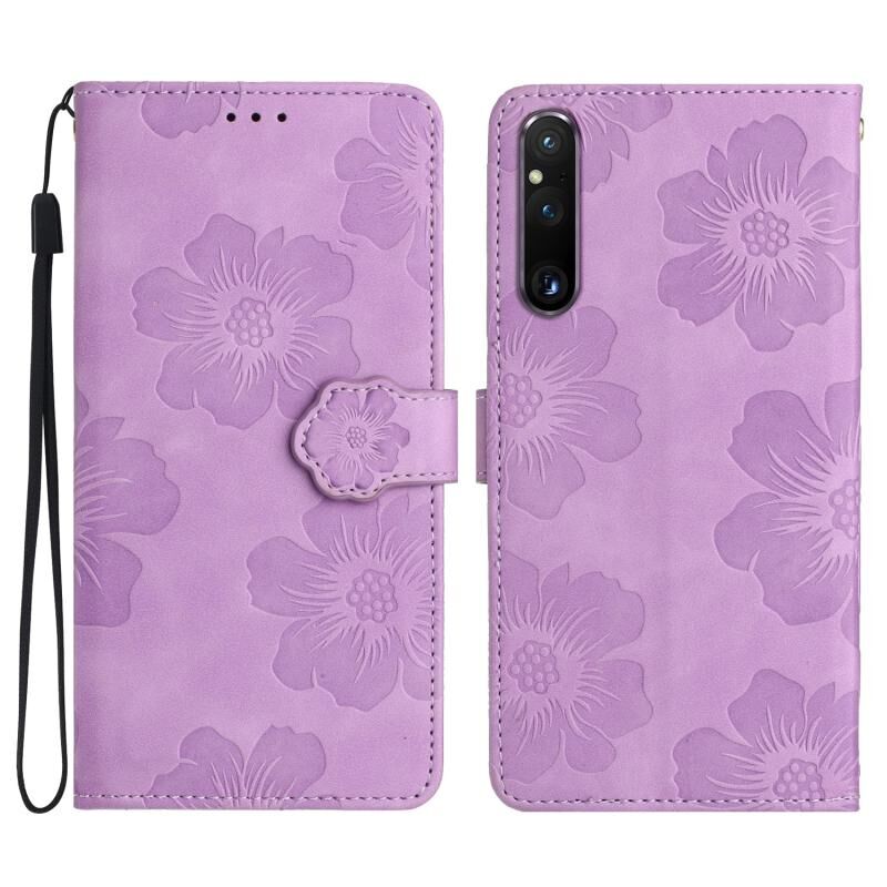 Για Sony Xperia 1 V λουλούδι ανάγλυφο μοτίβο δερμάτινη θήκη τηλεφώνου (μωβ)