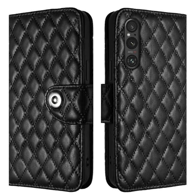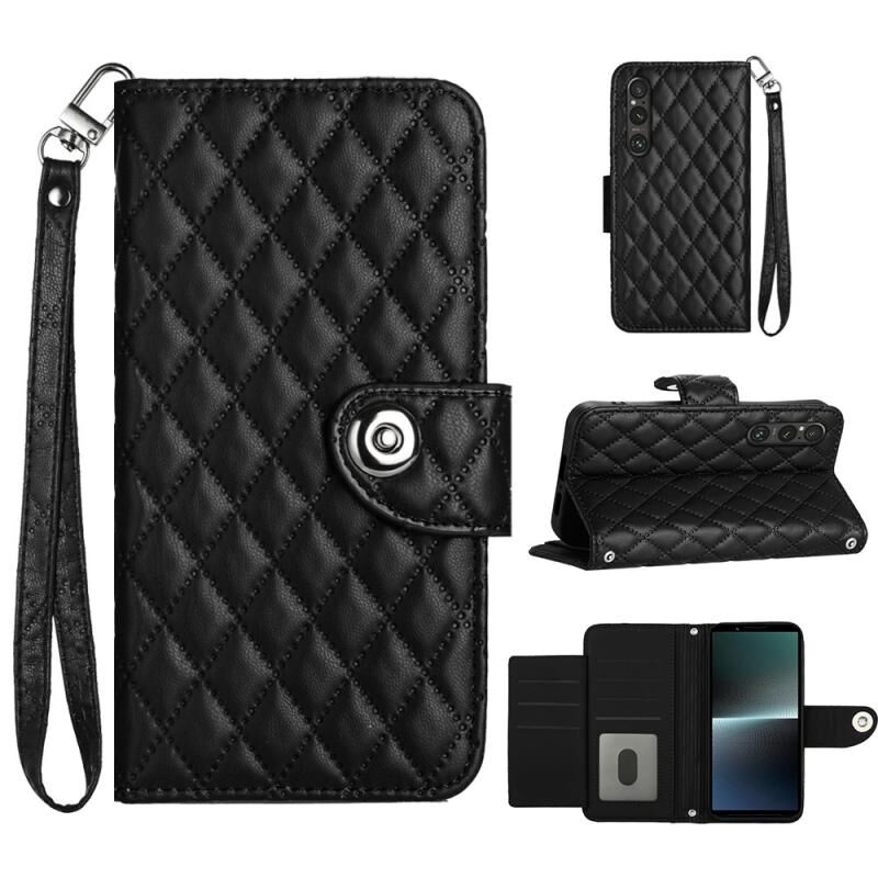 Για το Sony Xperia 1 V Rhombic Texture Flip δερμάτινη θήκη τηλεφώνου με κορδόνι (μαύρο)