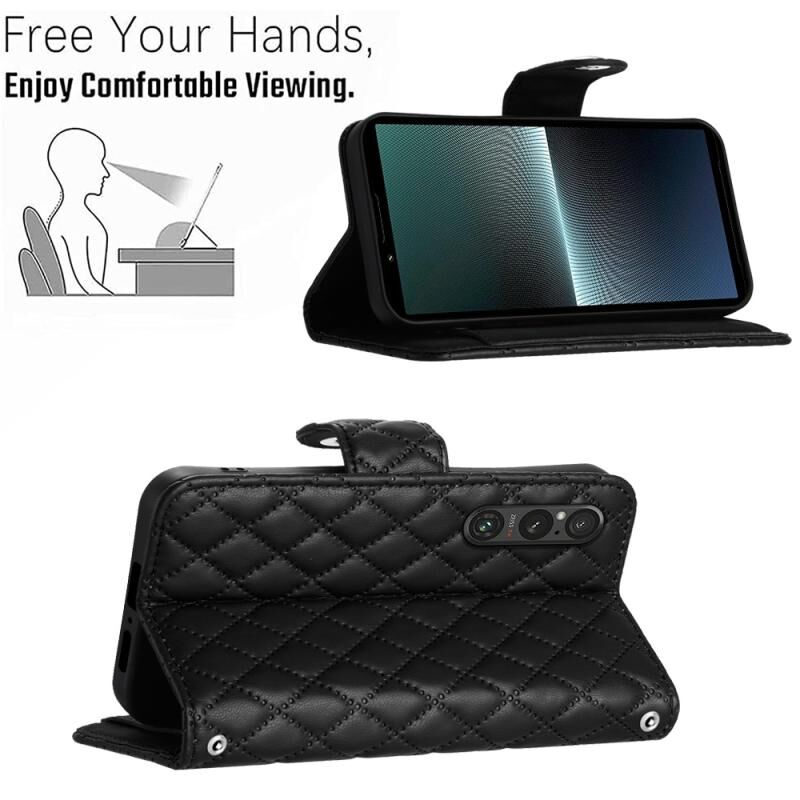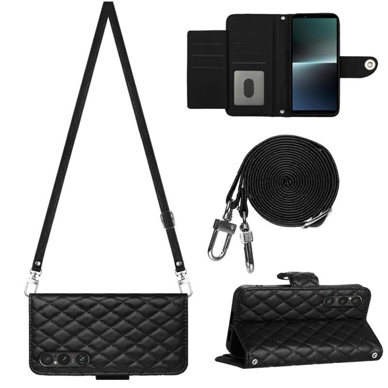 Για το Sony Xperia 1 V Rhombic Texture Flip δερμάτινη θήκη τηλεφώνου με μακρύ κορδόνι (μαύρο)