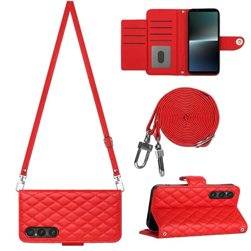 Για Sony Xperia 1 V Rhombic Texture Flip δερμάτινη θήκη τηλεφώνου με μακρύ κορδόνι (κόκκινο)