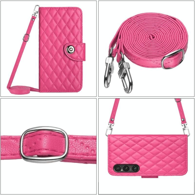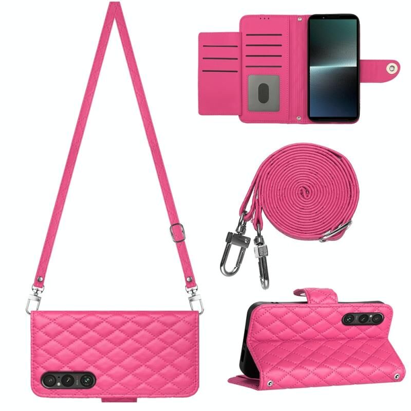 Για το Sony Xperia 1 V Rhombic Texture Flip δερμάτινη θήκη τηλεφώνου με μακρύ κορδόνι (Rose Red)