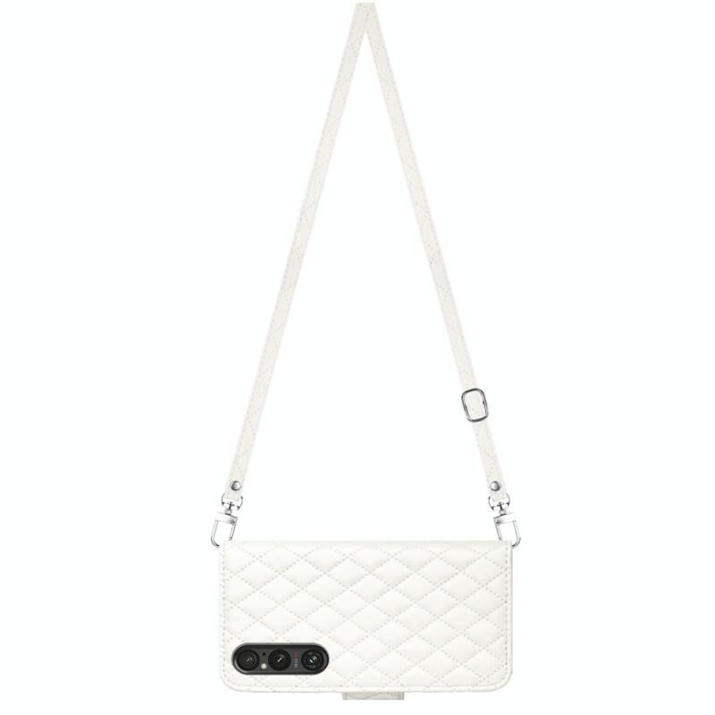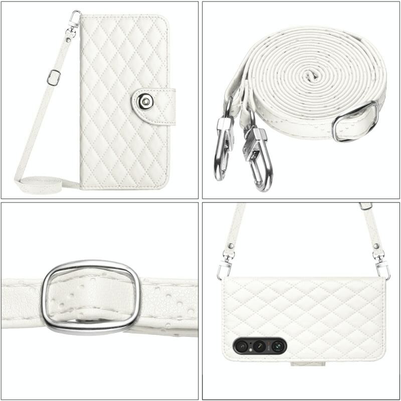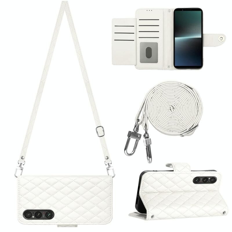Για το Sony Xperia 1 V Rhombic Texture Flip δερμάτινη θήκη τηλεφώνου με μακρύ κορδόνι (λευκό)