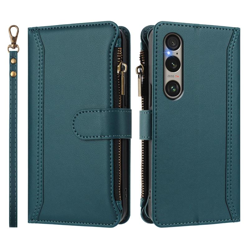 For Sony Xperia 1 VI 2024 Magnetic Closure 9 Card Slots Zipper Leather Case with Hand Strap(Dark Green)