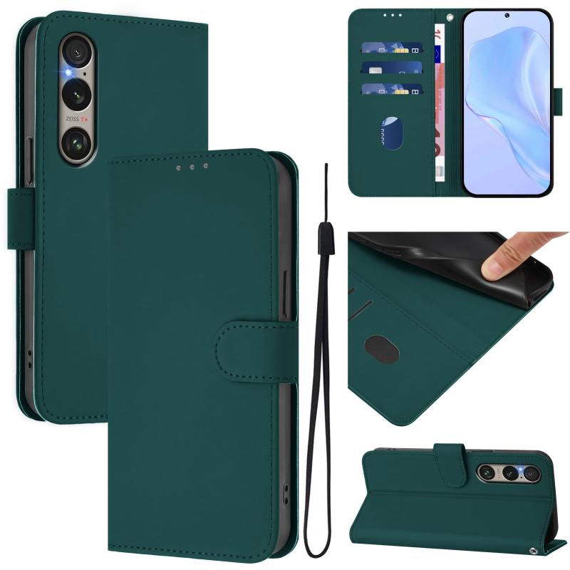 For Sony Xperia 1 VI 2024 Skin Feel Solid Color Leather Phone Case with Lanyard(Dark Green)