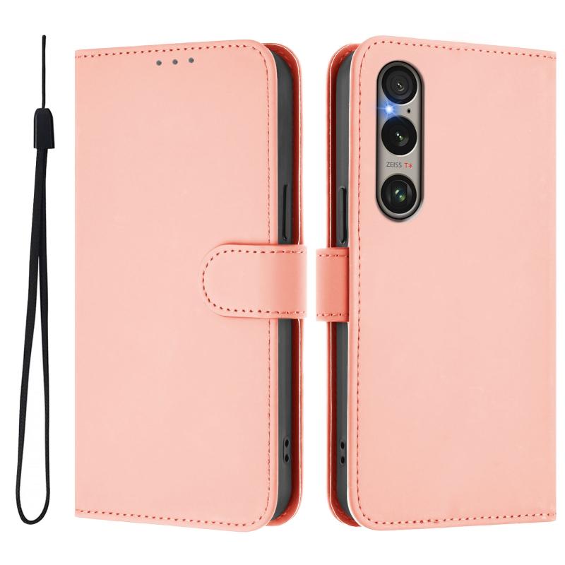 For Sony Xperia 1 VI 2024 Skin Feel Solid Color Leather Phone Case with Lanyard(Pink)