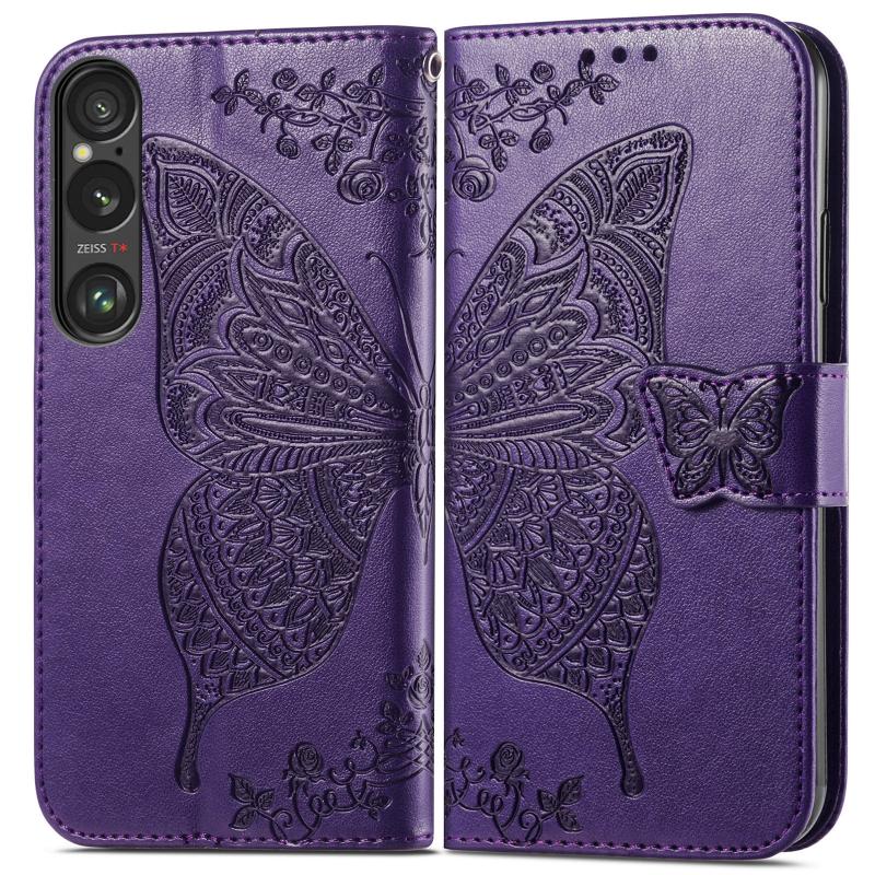 For Sony Xperia 1 VI Butterfly Love Flower Embossed Leather Phone Case(Purple)