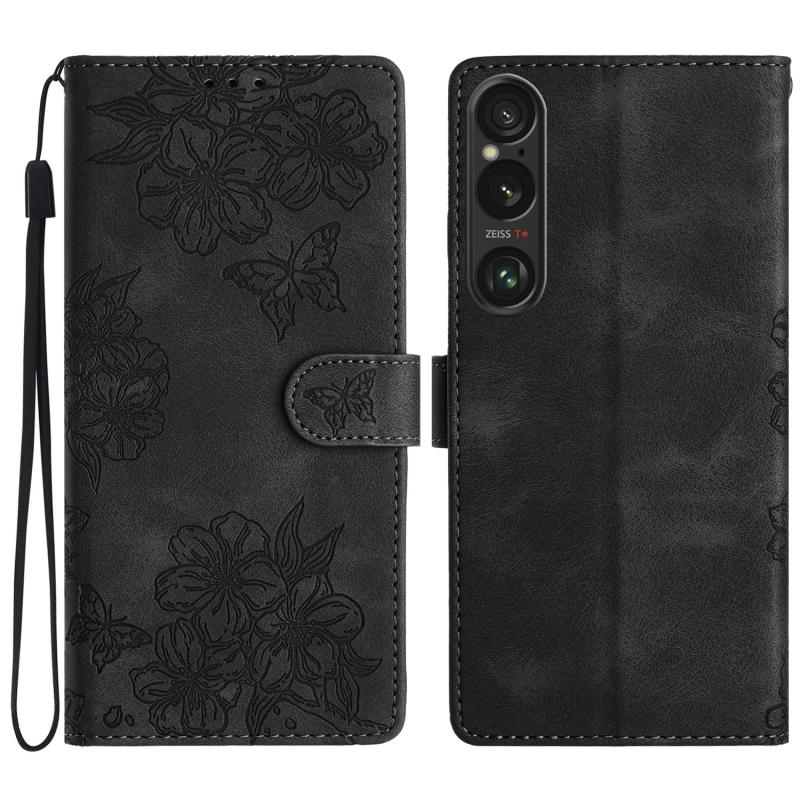 For Sony Xperia 1 VI Cherry Blossom Butterfly Skin Feel Embossed PU Phone Case(Black)