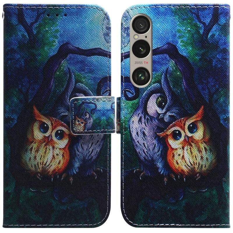 Θήκη τηλεφώνου από δέρμα με αναδιπλούμενο σχέδιο για Sony Xperia 1 VI (κουκουβάγια ζωγραφισμένη με λάδι)