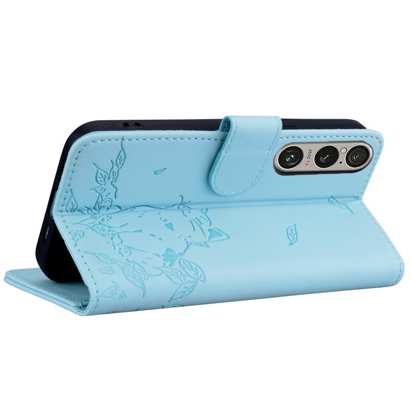 For Sony Xperia 1 VI Cute Cat Embossed Leather Phone Case(Sky Blue)