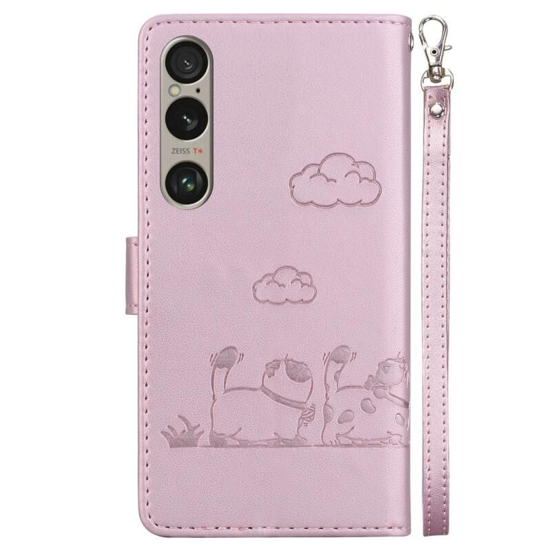 Θήκη τηλεφώνου από δέρμα με τεχνολογία RFID για Sony Xperia 1 VI (Χρυσό Ρόδινο) με χαριτωμένες γάτες.