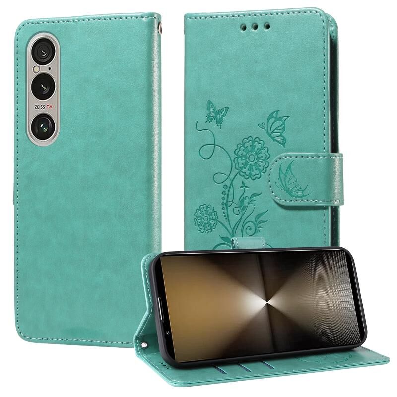 Θήκη τηλεφώνου δερμάτινη με ανάγλυφα λουλούδια πεταλούδας για Sony Xperia 1 VI (Μωβ)