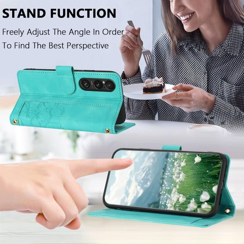 Θήκη τηλεφώνου από δέρμα με ανάγλυφα τουλίπες για Sony Xperia 1 VI με κορδόνι (Ροζ)