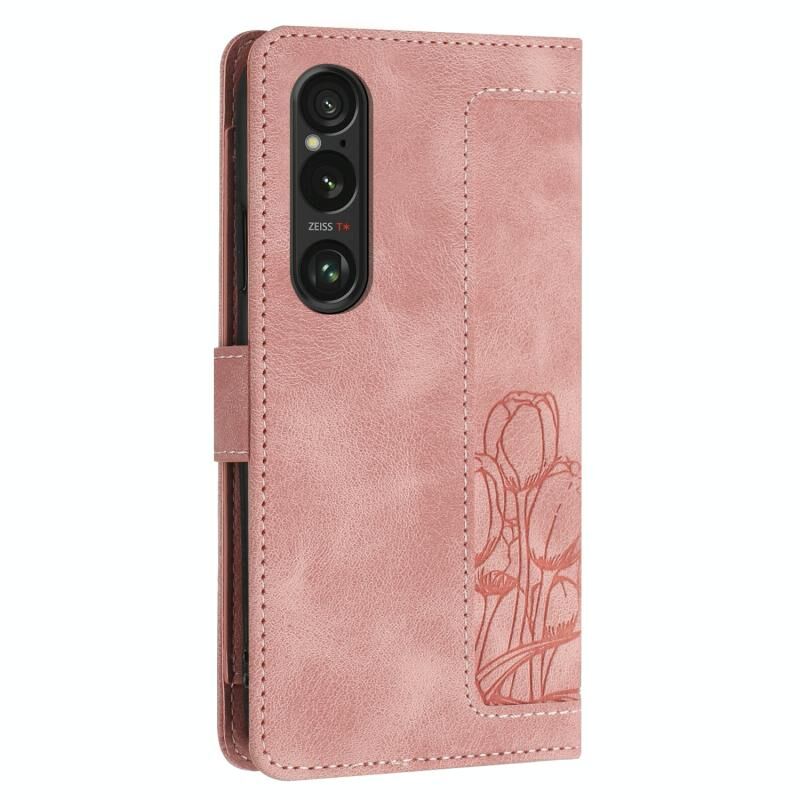 Θήκη τηλεφώνου από δέρμα με ανάγλυφα τουλίπες για Sony Xperia 1 VI με κορδόνι (Ροζ)