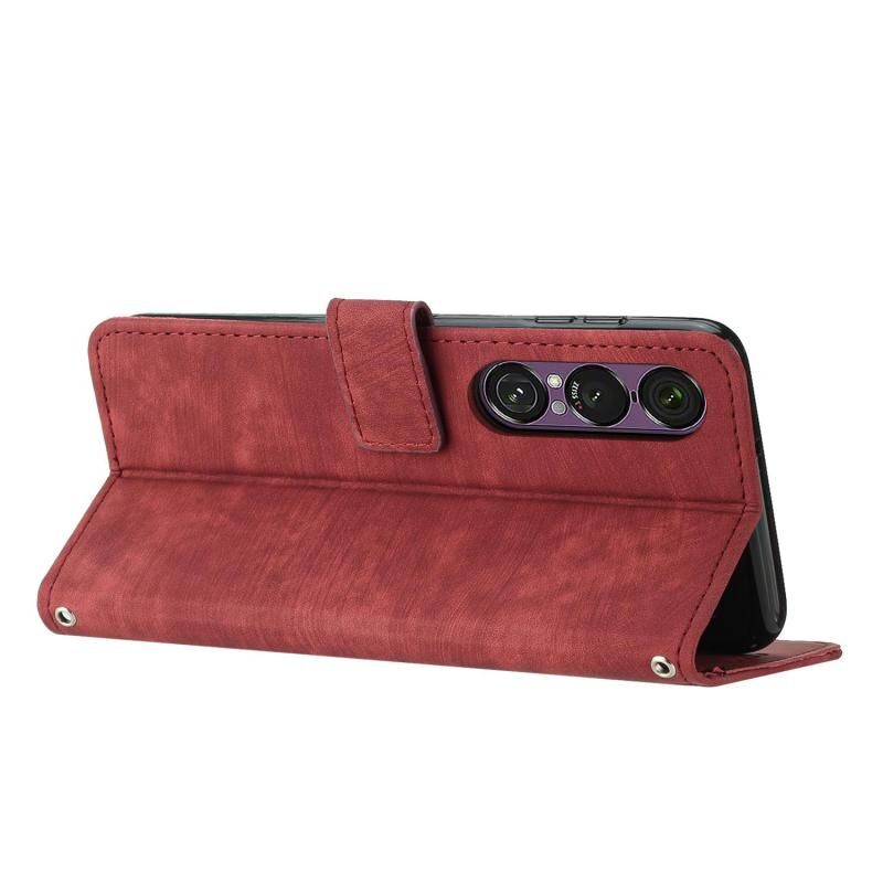 For Sony Xperia 1 VII Skin Feel Stripe Pattern Leather Phone Case with Lanyard(Red)