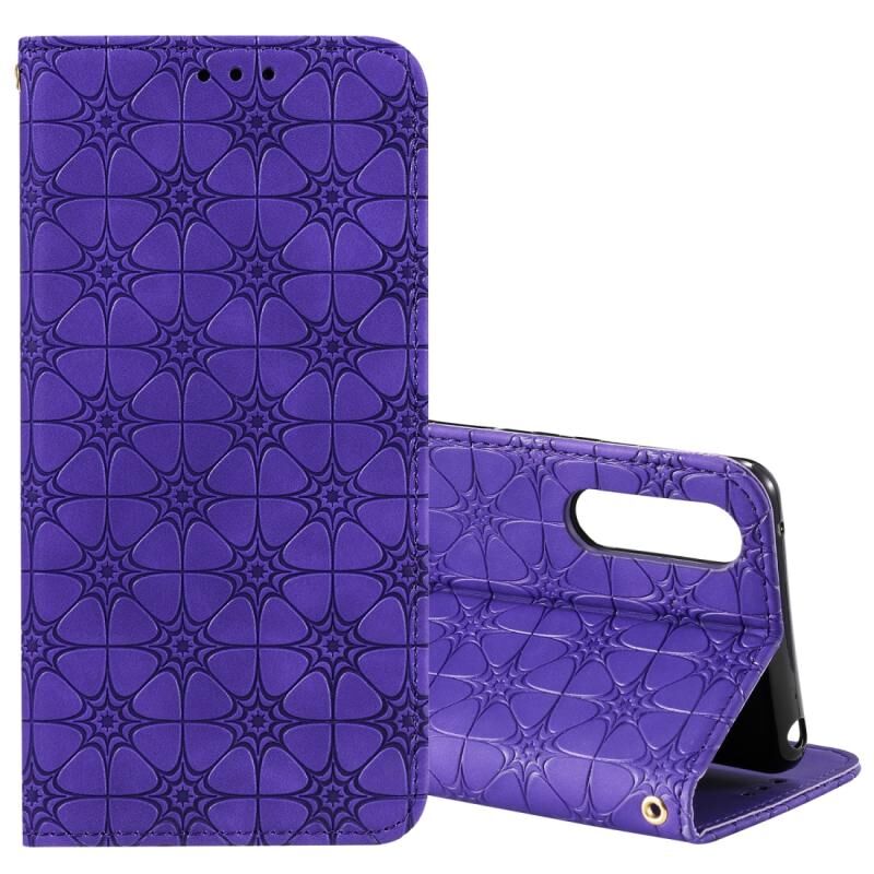 Θήκη δέρματος με μαγνητικό κλείσιμο, οριζόντια, με ανάγλυφο σχέδιο τυχερών λουλουδιών για Sony Xperia 10 II, με βάση και θήκες για κάρτες (Καφέ)