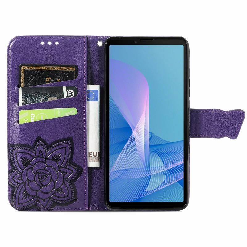 Για Sony Xperia 10 III Πεταλούδα αγάπη λουλούδια ανάγλυφο οριζόντια Flip δερμάτινη θήκη με υποδοχές για κάρτες & υποδοχές & πορτοφόλι & κορδόνι (σκούρο μωβ)