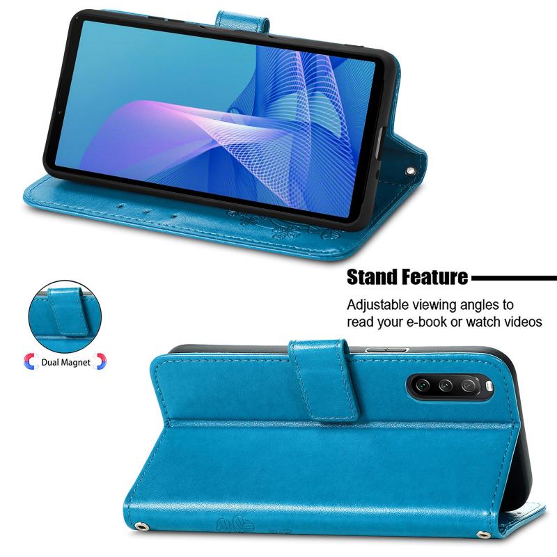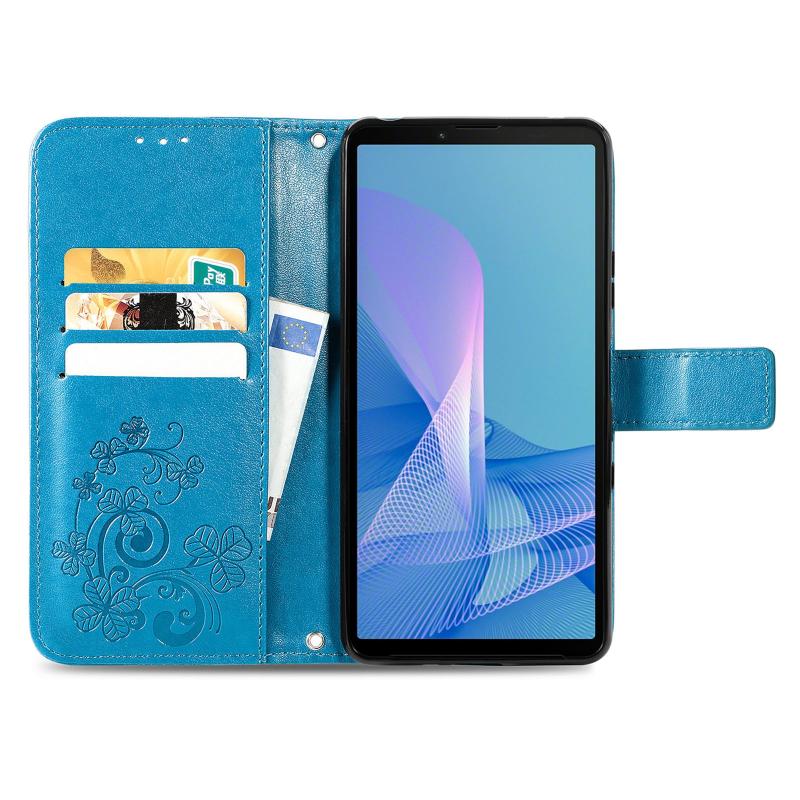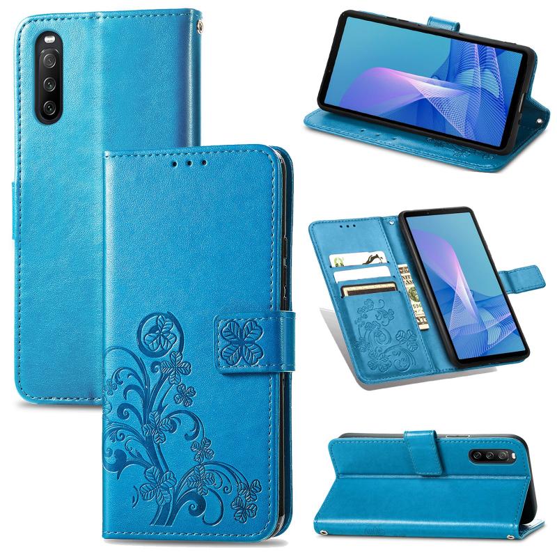 For Sony Xperia 10 III Four-leaf Clasp Embossed Buckle Mobile Phone Protection Leather Case with Lanyard & Card Slot & Wallet & Bracket Function(Blue)