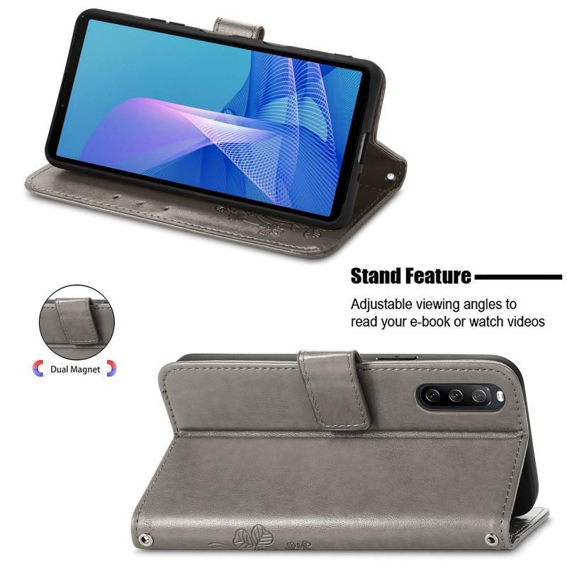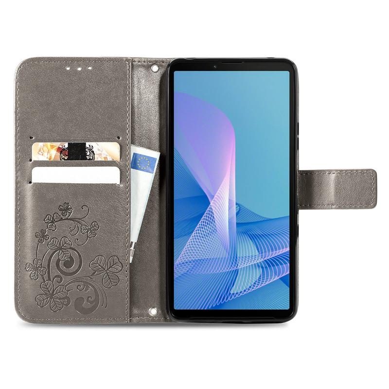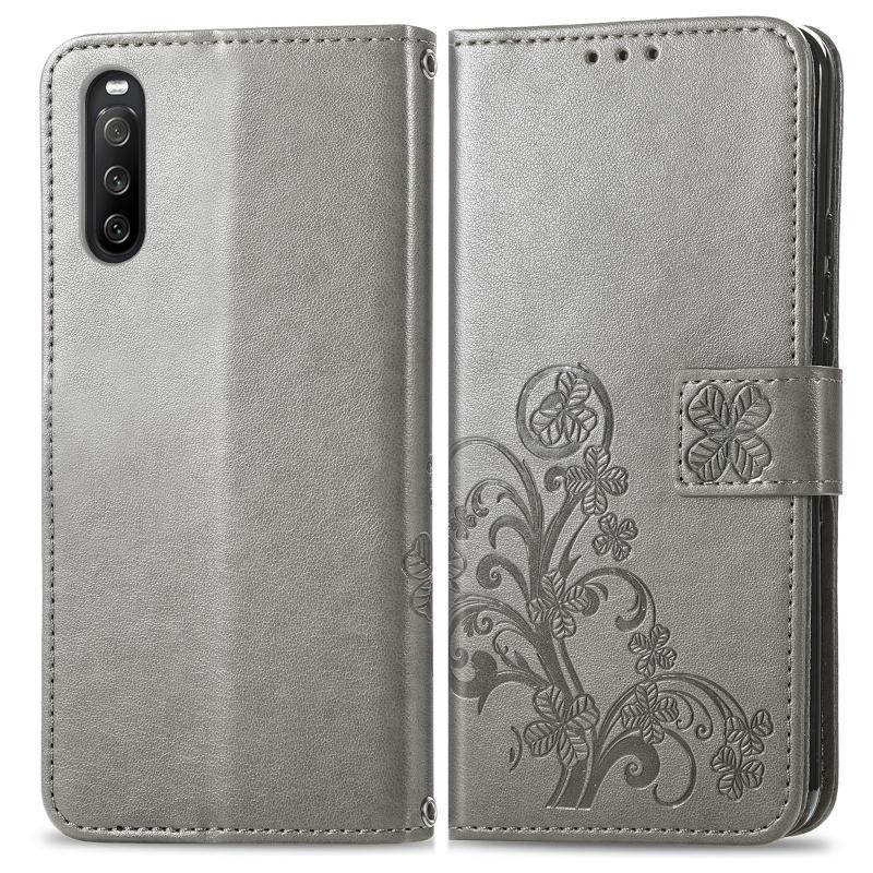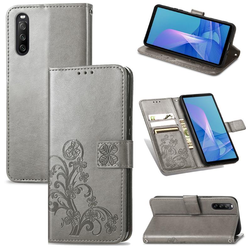 For Sony Xperia 10 III Four-leaf Clasp Embossed Buckle Mobile Phone Protection Leather Case with Lanyard & Card Slot & Wallet & Bracket Function(Gray)