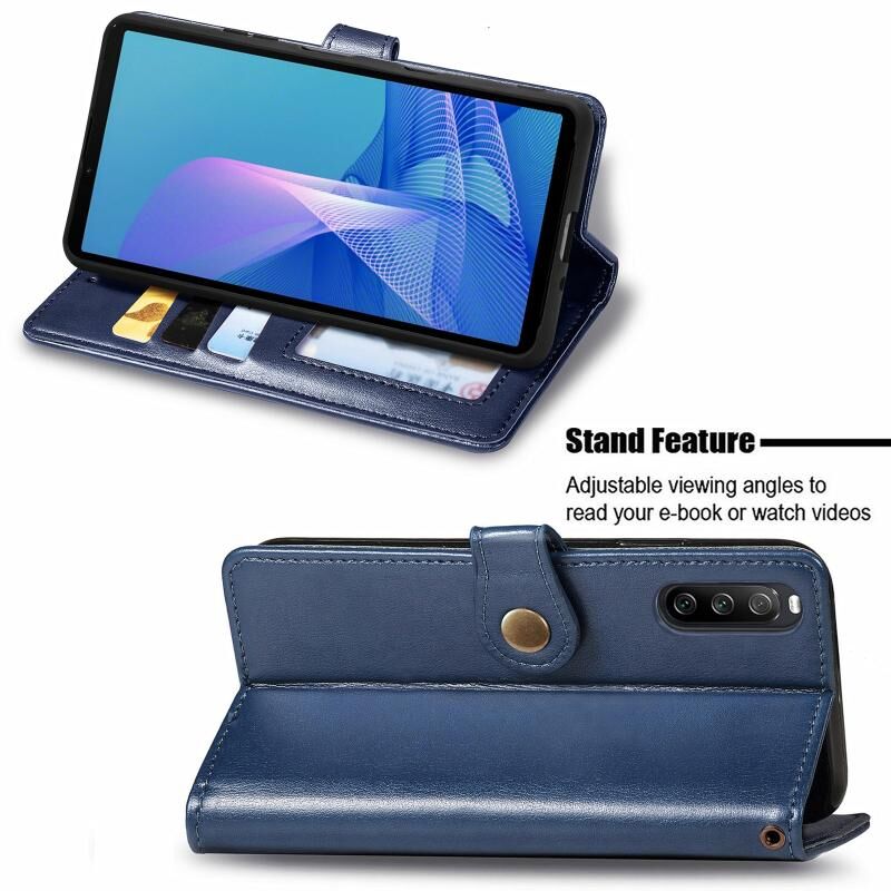Για Sony Xperia 10 III Αμιγές χρώμα Δερμάτινη θήκη τηλεφώνου με αγκράφα και κορνίζα φωτογραφιών, υποδοχή για κάρτες, πορτοφόλι και λειτουργία στάσης (μπλε)