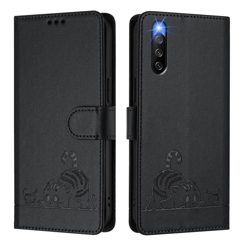 For Sony Xperia 10 IV Cat Rat Embossed Pattern RFID Leather Phone Case with Lanyard(Black)