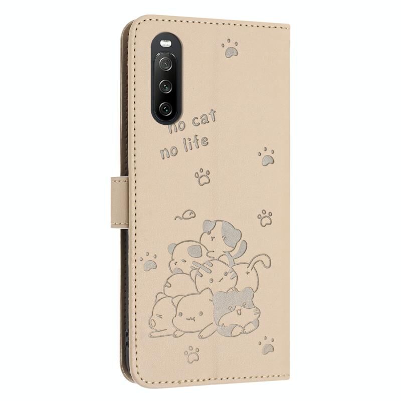 Θήκη δερμάτινη για Sony Xperia 10 IV με ανάγλυφο γατάκι και λουρί (Μπεζ)