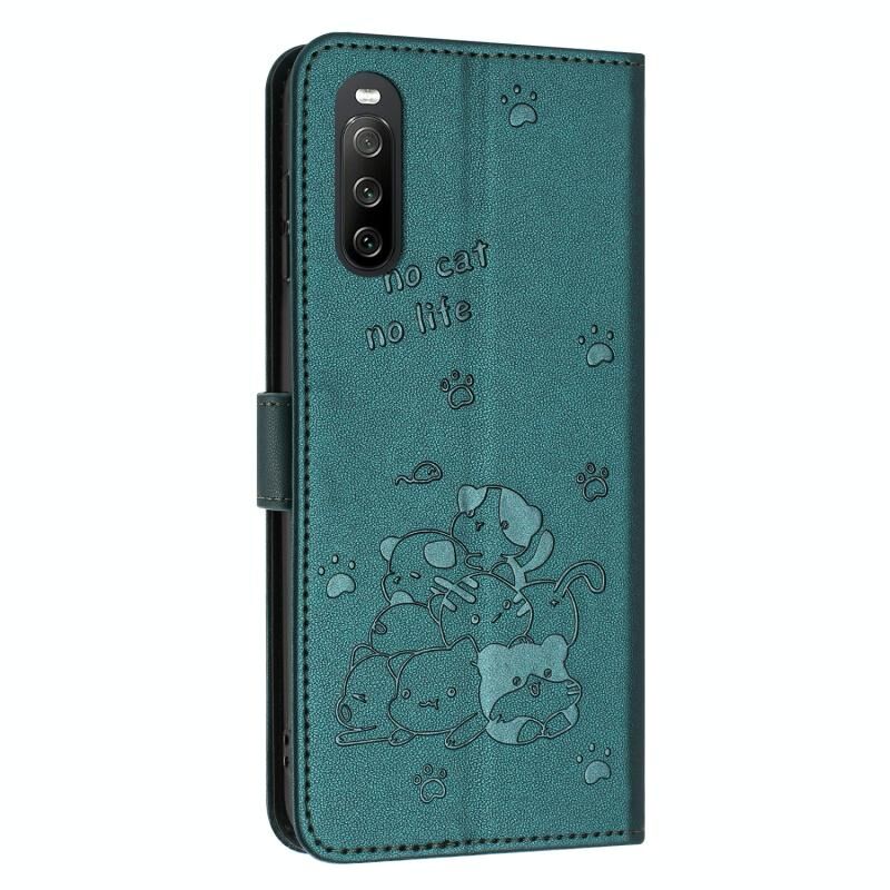 Θήκη δερμάτινη για Sony Xperia 10 IV με ανάγλυφο γατάκι και λουρί (Μωβ)